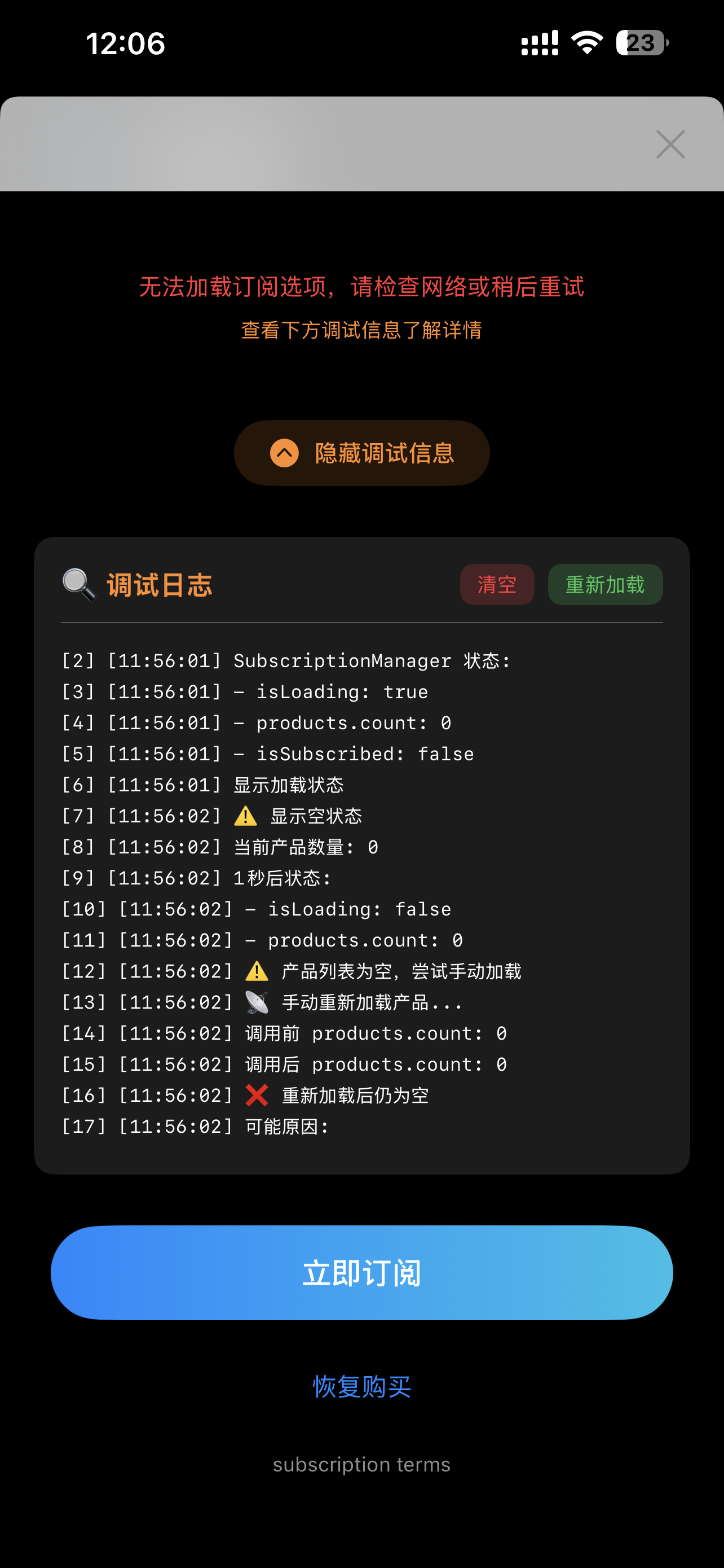 到底是哪里的问题导致 tesfFlight 的测试 app 无法加载显示订阅呢