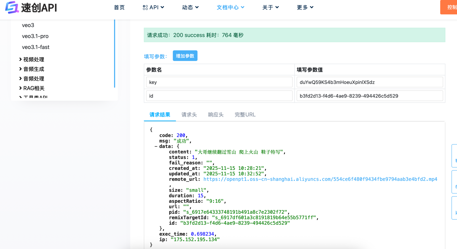 curl -X POST "https://api.wuyinkeji.com/api/sora2/submit" \ -H "Authorization: duYwo59iXS4b3mHoeuXpinIXSdz" \ -H "Content-Type: application/x-www-form-urlencoded;charset:utf-8;" \ -d "prompt=一个大程序键子重置,鞋子补写&url=https://openpt1.oss-cn-shanghai.aliyuncs.com/?d9d0e5a60074&aspectRatio=9:16&duration=15&size=small" 关键响应: