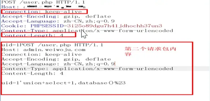 (3)进行完前两点设置后,开始下一步操作,将请求包复制到 uid=1 后面的位置,中间不需要空格。测试过程中服务端验证只需要带----cookie 即可,也就是第一个请求报带即可。发送修改后的双请求,返回响应也是两次,大多数 waf 只检测第一个请求,忽略第二个请求,从而绕过 WAF 的检测。