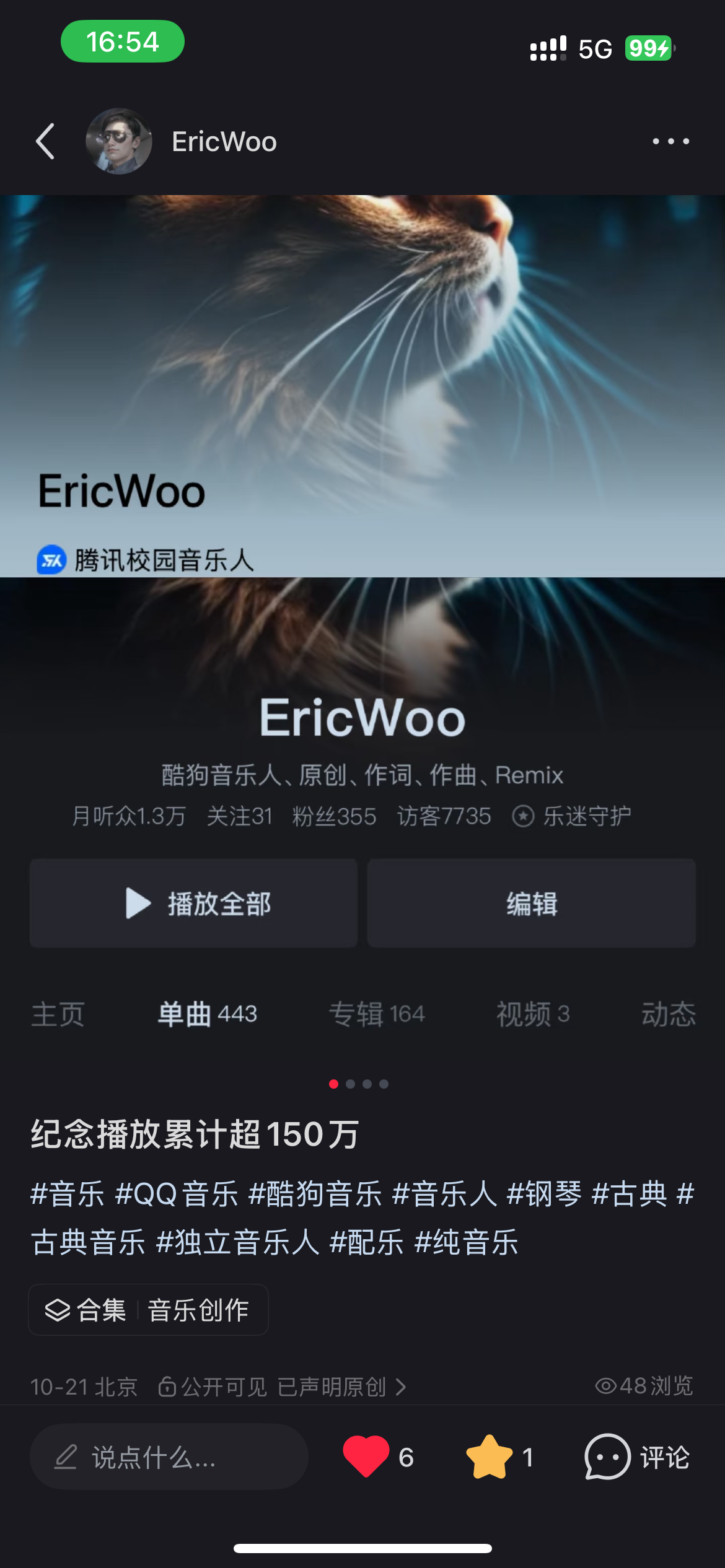 第三学期签约了企鹅音乐,作为独立音乐人(也是 Solo 哈哈),业余时间发行了一些原创、改编的歌曲,目前也有 50 几首作品,博士期间会不定期的创作,也算一种见证。