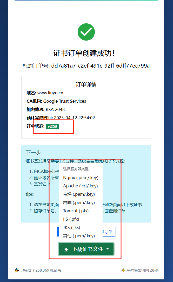 第六步:下载证书 证书签发成功后,您可以在 SSLFlux 平台下载证书文件。平台提供多种格式以满足不同服务器需求:
