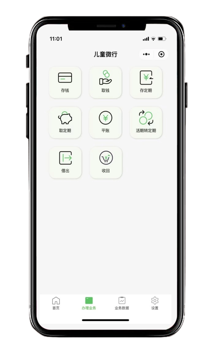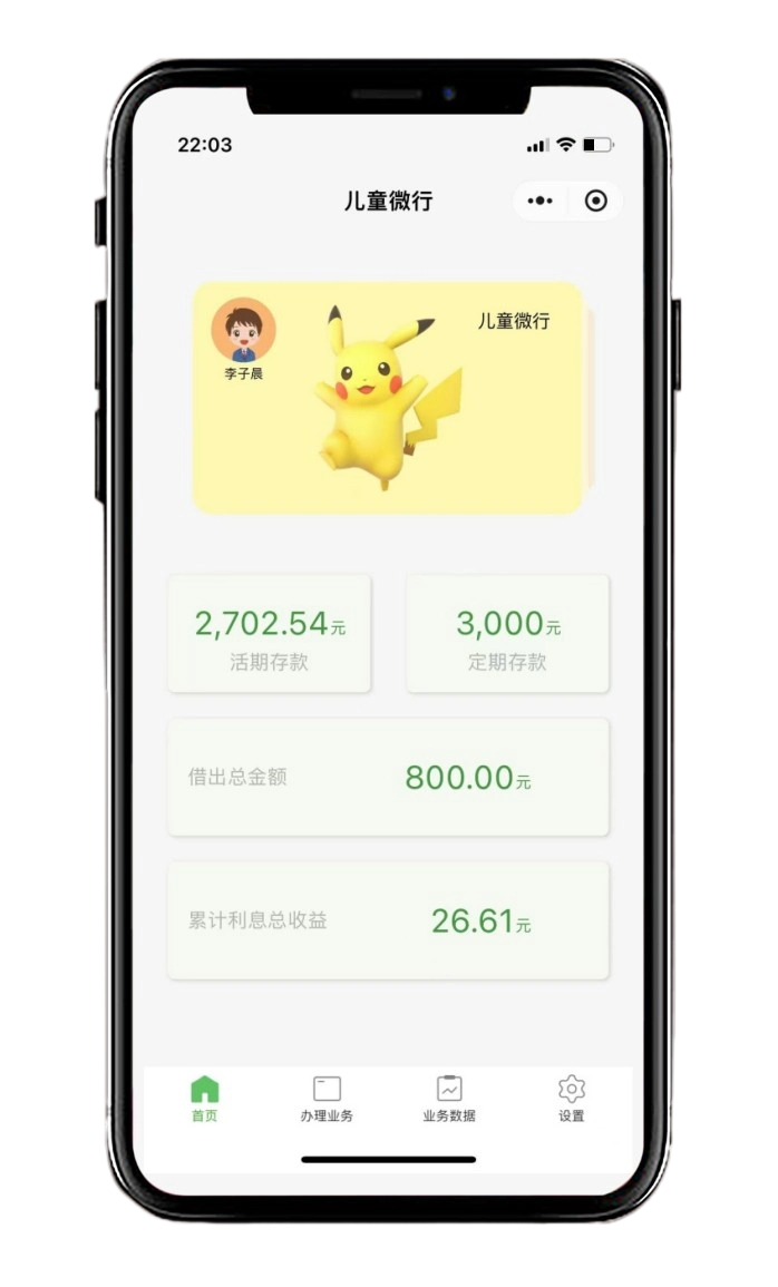 产品介绍 它完全模拟了生活中真实银行的业务, 1、包括活期存钱 2、定期存钱 3、取钱 4、借钱 5、活期利息 父母扮演银行,孩子扮演银行客户,孩子自己的钱交给父母保管,金额多少,利息计算,钱如何被使用全部记录在儿童微行里。 它作为父母和孩子中间公平的平台工具,可以让孩子放心的把钱交给父母保管,关于钱的所有行为都会被记录供大家查看。