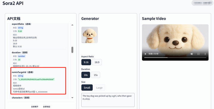 注意: 1.核心参数 remixTargetId:这是 Remix 功能的关键,必须填入源视频的唯一标识 pid(格式通常为 s_xxxxxxxxxxxxxxx)。此 pid 可在视频第一次生成的成功响应中获取。