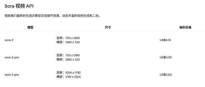 标准版 (sora-2, 720p):$0.10/秒(¥7/条 10s 视频,¥11/条 15s 视频)