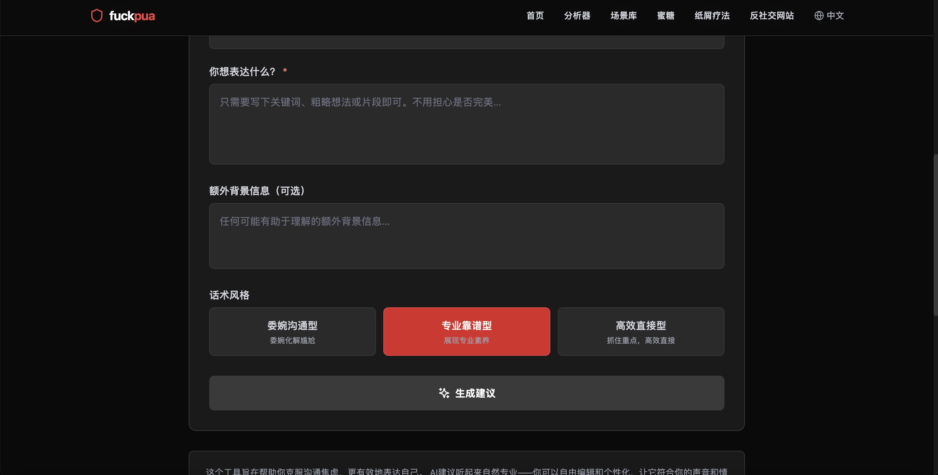 告诉 AI 对话者是谁、你们的关系、你的感受,以及想表达的核心内容。AI 根据这些信息生成表达建议。选择风格:委婉沟通型化解尴尬,专业靠谱型展现专业素养,高效直接型抓住重点。生成的建议基于你的真实情况,可以直接使用,也可以修改让它更符合你的表达习惯。最终的表达属于你,只是有了一个清晰的起点,不再需要从空白开始。