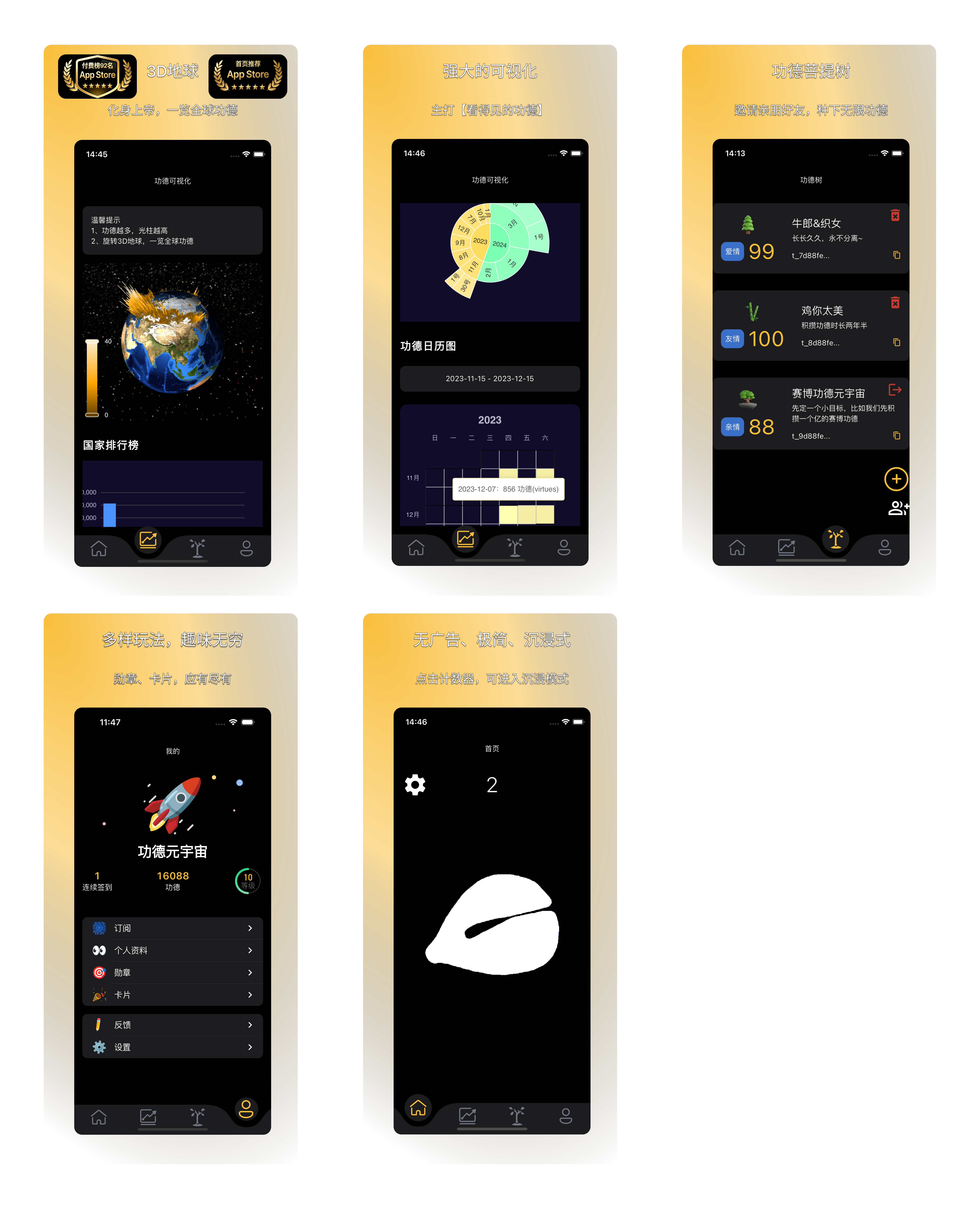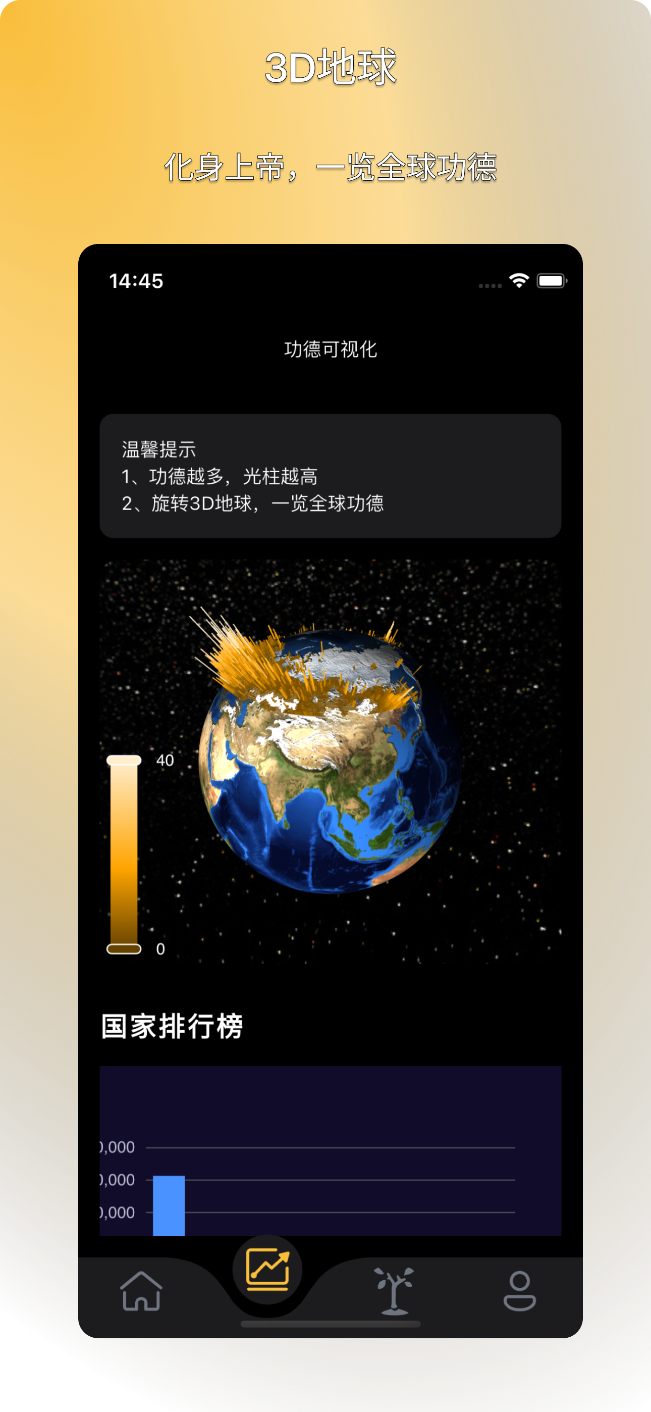 1. 3D 地球上帝视角|全网独一份的沉浸感 打开 APP 的瞬间直接被惊艳到!不是单调的木鱼界面,而是一个可旋转、可缩放的 3D 地球,你就是俯瞰全球的 “功德观察者”,能清晰看到全球用户的功德分布,每一次敲击,都能感受到 “自己的善行和全世界同频” 的奇妙体验,再也不是一个人默默敲木鱼,仪式感直接拉满。