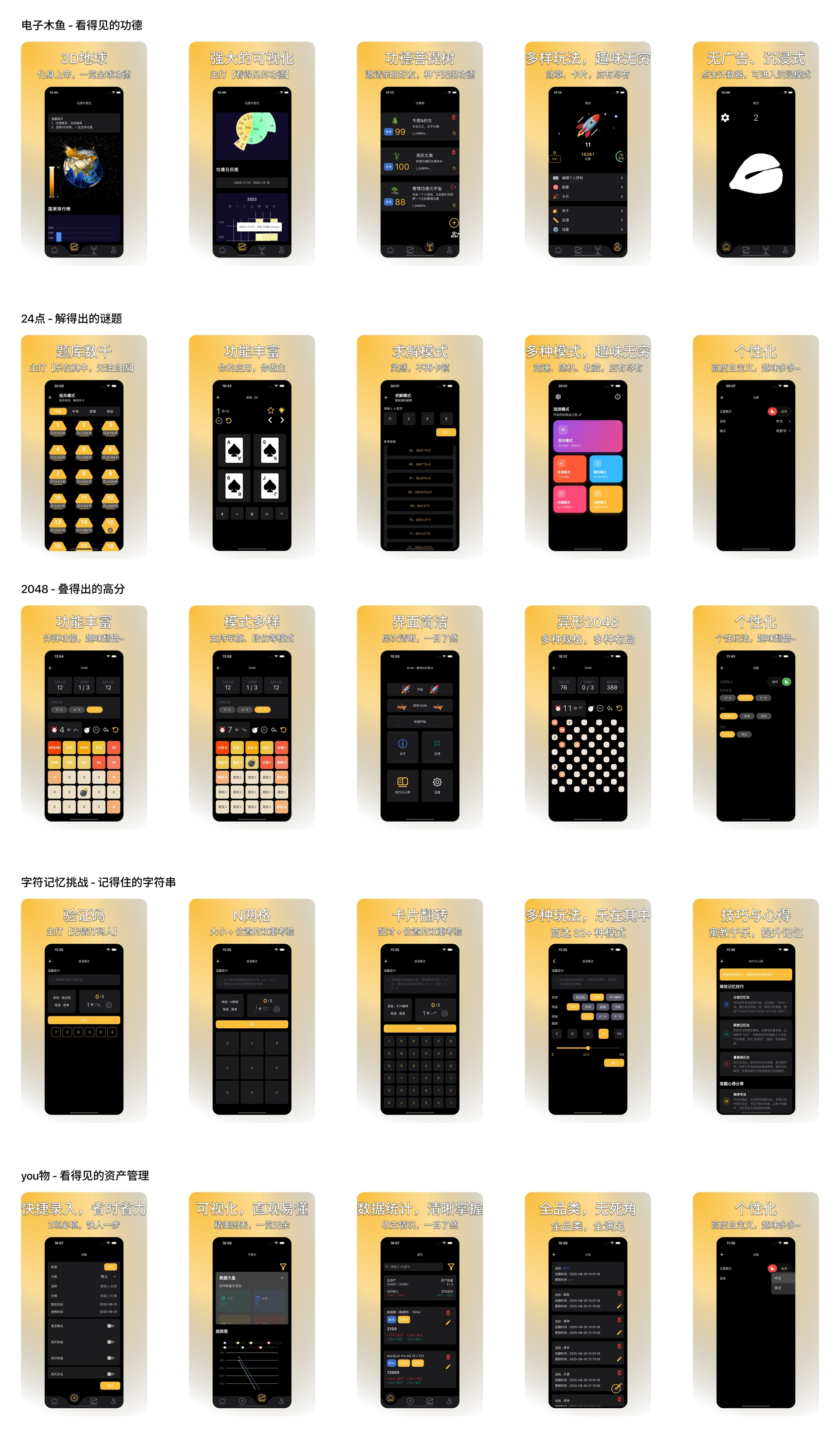 2.其他 APP(分别是《电子木鱼 - 看得见的功德》、《 24 点 - 解得出的谜题》、《 2048 - 叠得出的高分》、《字符记忆挑战 - 记得住的字符串》、《 you 物 - 看得见的资产管理》)- 概览图(注:目前也在陆续开发益智、解谜类、娱乐解压类的 app 和游戏中,敬请期待与关注~)