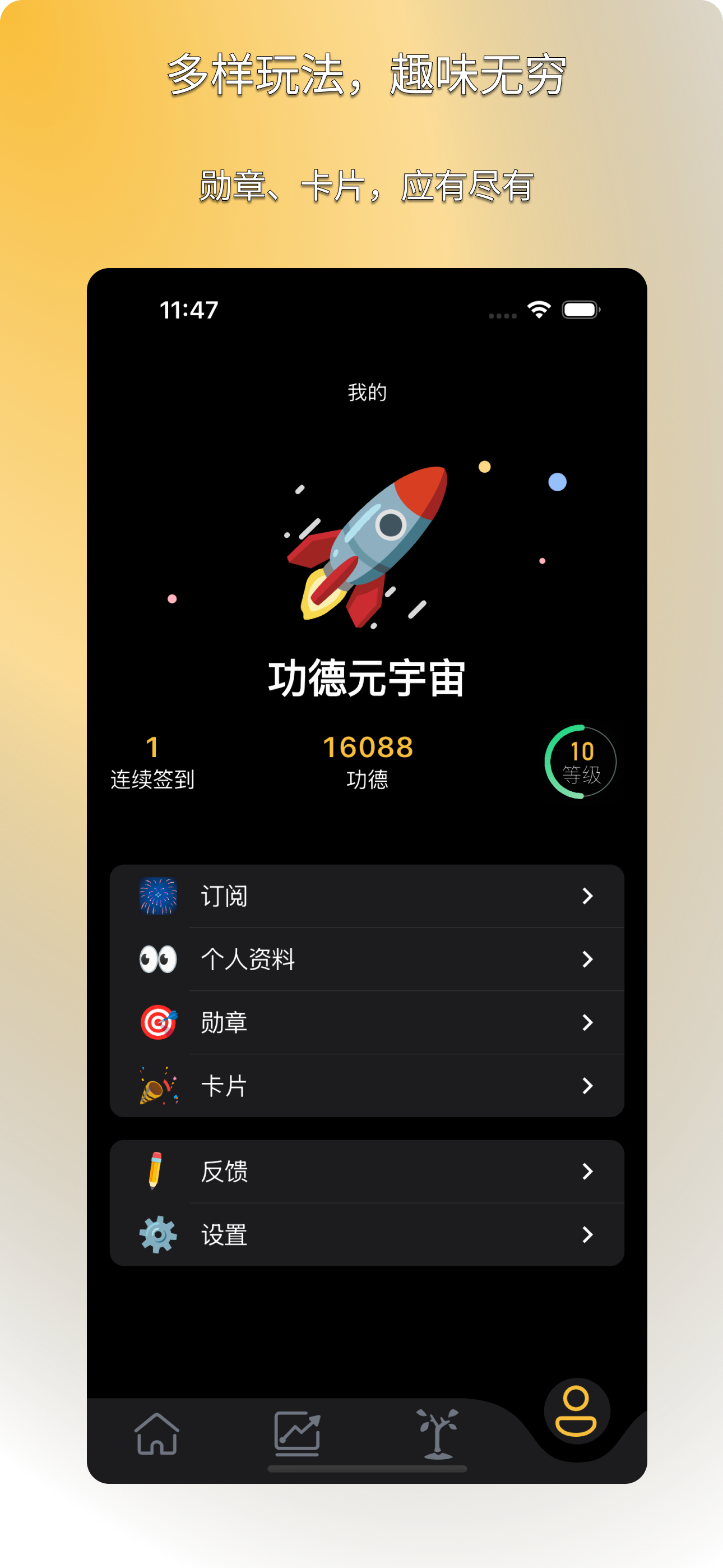 1. 多样玩法加持|积德不枯燥,越玩越上头 怕敲木鱼太单调?不存在的!内置勋章系统、卡片收集玩法,每积累一定功德,就能解锁专属勋章、限定卡片,不同卡片还有隐藏小彩蛋,既能享受积德的治愈感,又能体验收集的乐趣,摸鱼、摸鱼、睡前放松时敲一敲,根本停不下来。