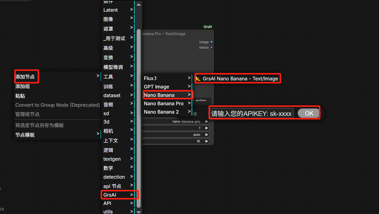 在 comfyui 空白处右键,添加节点,找到 GrsAi,选择模型,黏贴刚才复制的 APikey 即可使用