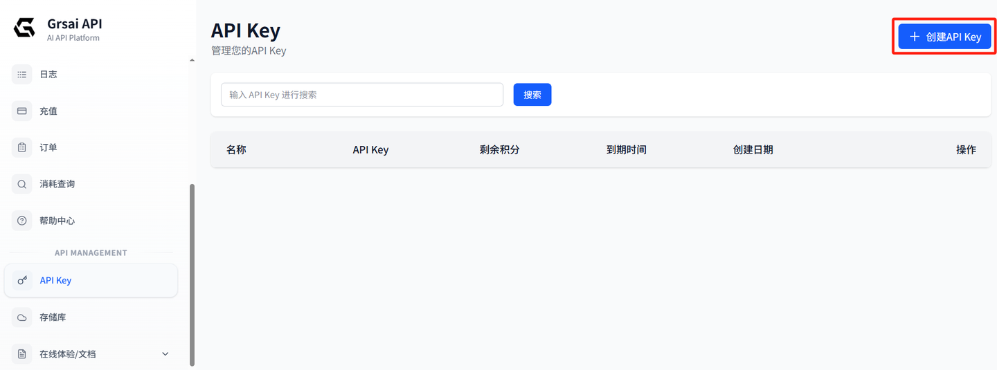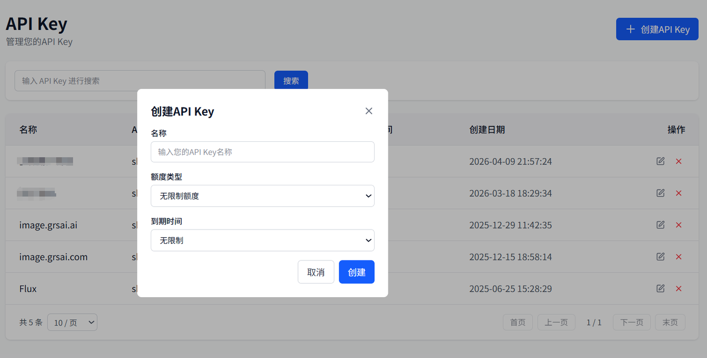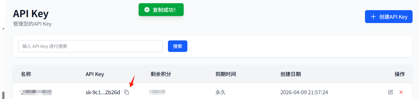 • 创建 APi key:点击 API Key 栏目,创建后复制(可以设置额度,以防 key 泄露工作流出问题导致额度刷光)