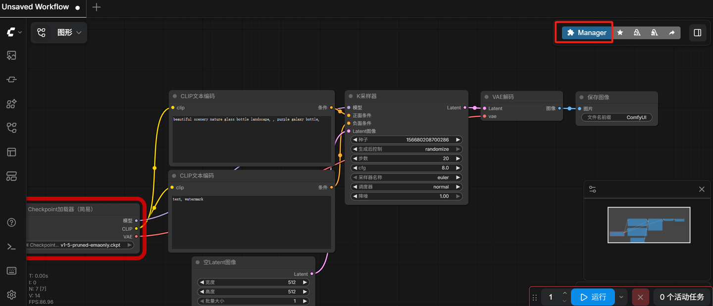 • 重启 ComfyUI(双击 bat 文件),右上角菜单会出现 Manager。