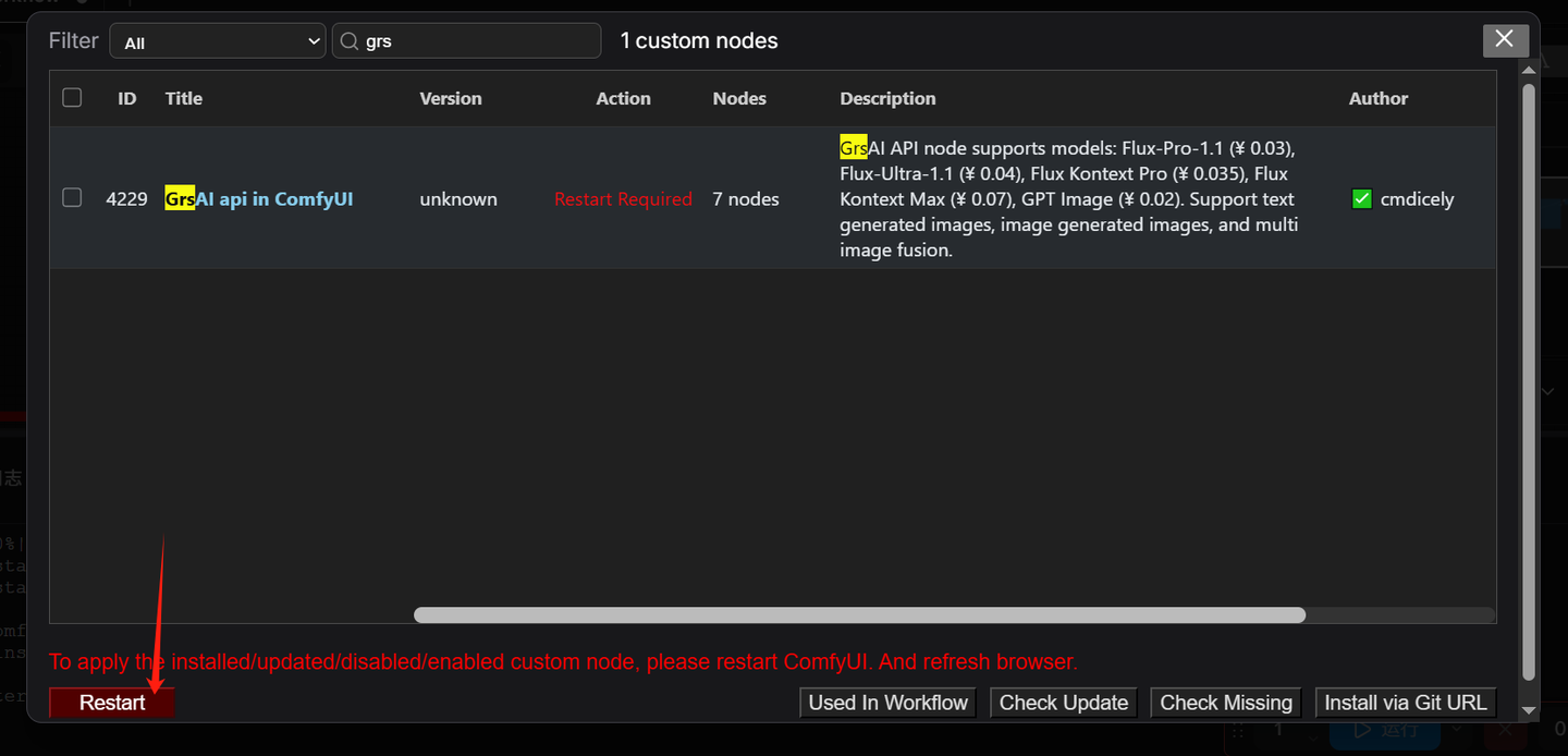 • 安装完后重启 ComfyUI
