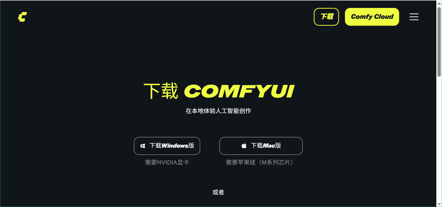 1. 打开浏览器,访问官方下载页面: https://www.comfy.org/download 支持 Win 和 mac 系统