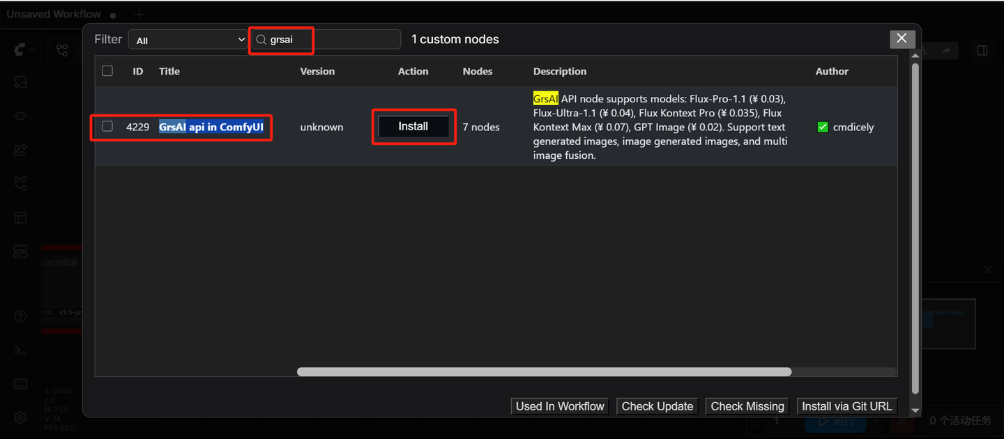 第一种:在 ComfyUI Manager 的 custom nodes Manager 里搜索 Grsai 进行安装